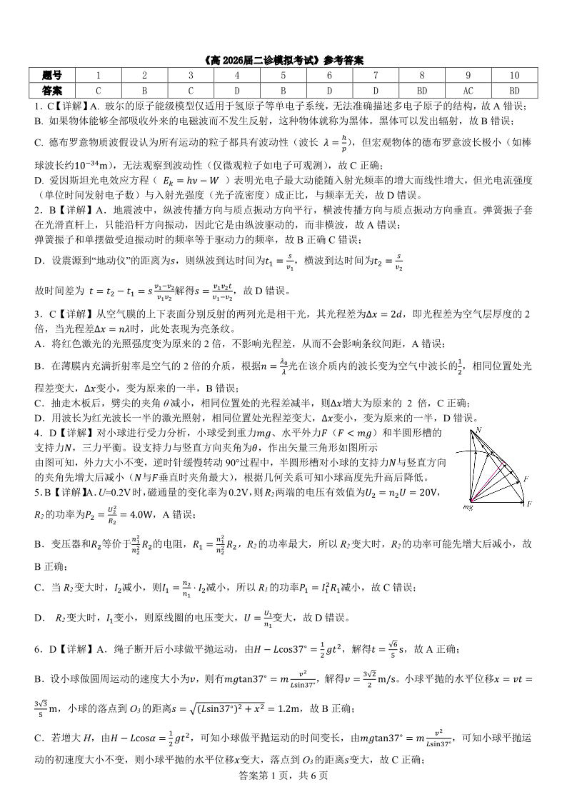 高三物理答案--四川省成都市第七中学2026届高三二诊模拟考试