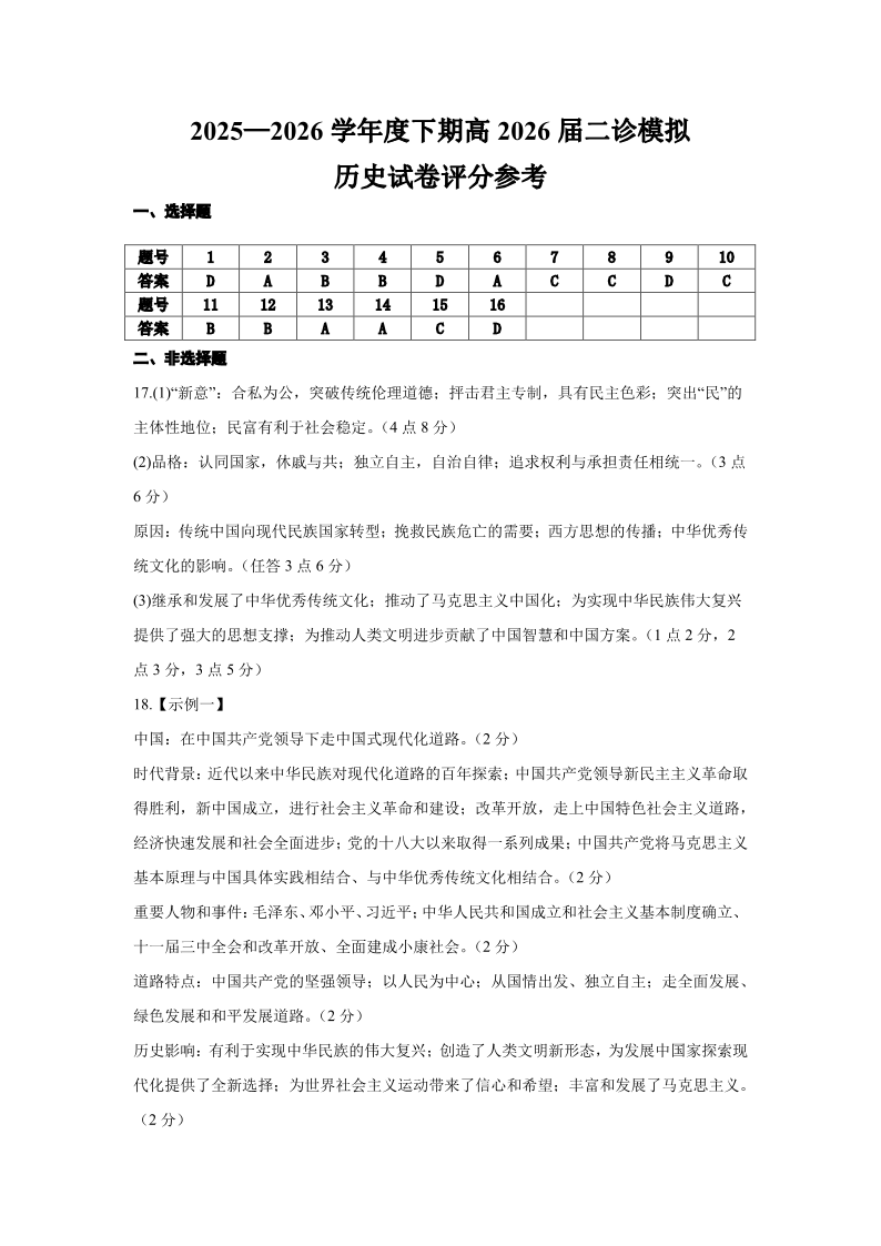 高三历史答案--四川省成都市第七中学2026届高三二诊模拟考试