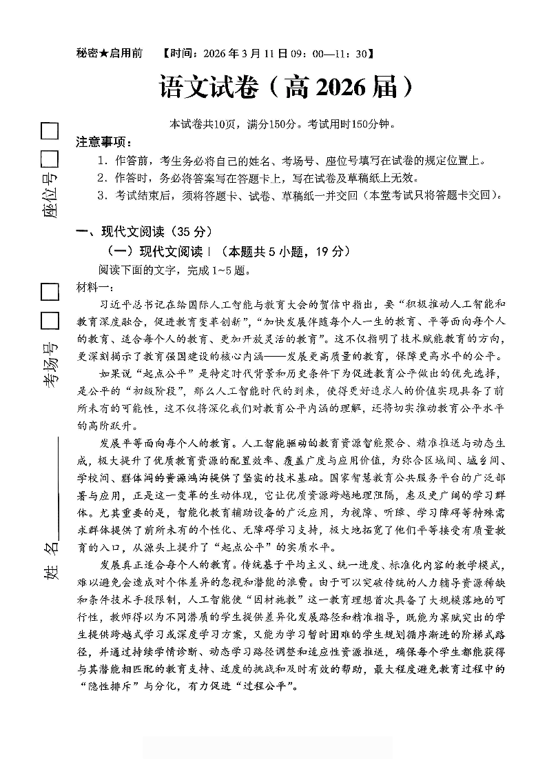 高三语文--重庆市名校联盟(七校联盟)2026届高三下学期3月开学联考