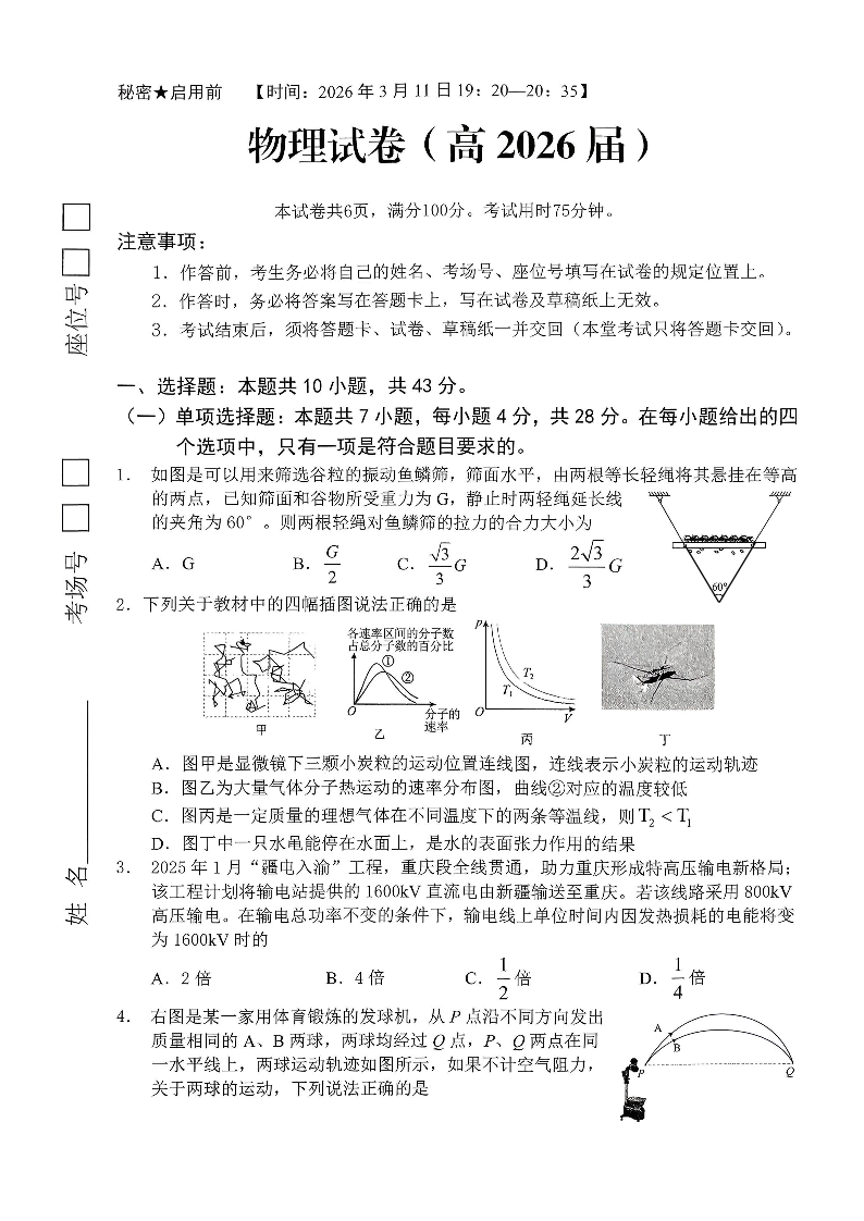高三物理--重庆市名校联盟(七校联盟)2026届高三下学期3月开学联考