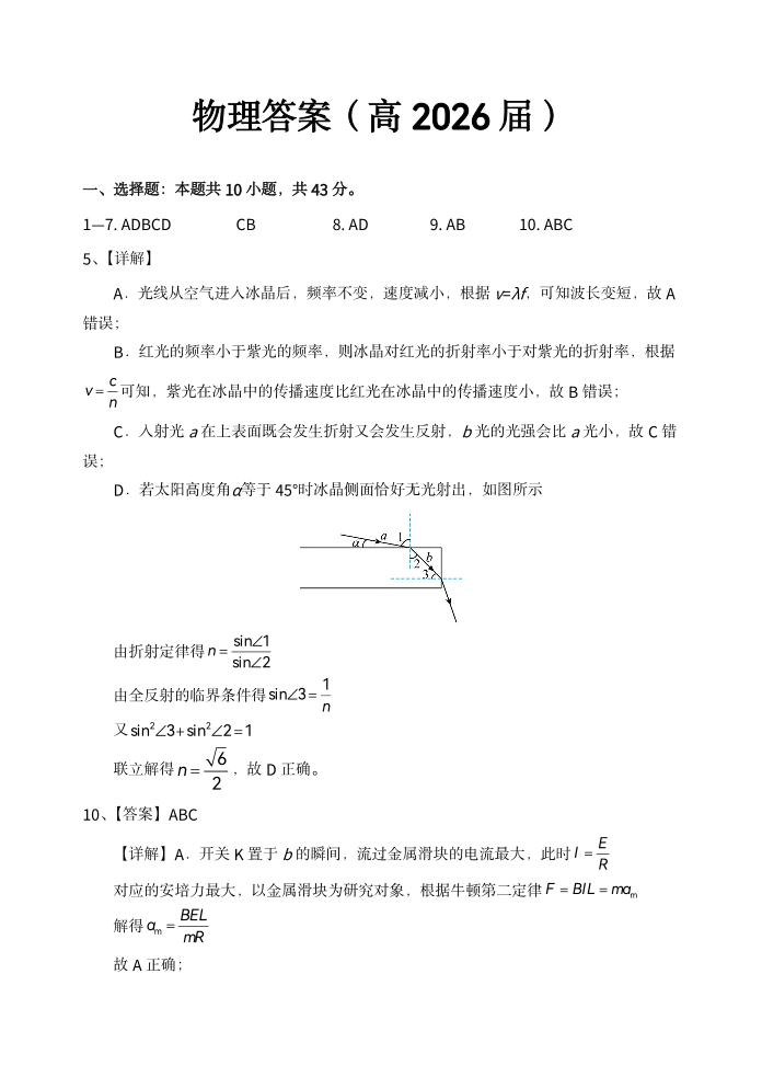 高三物理答案--重庆市名校联盟(七校联盟)2026届高三下学期3月开学联考