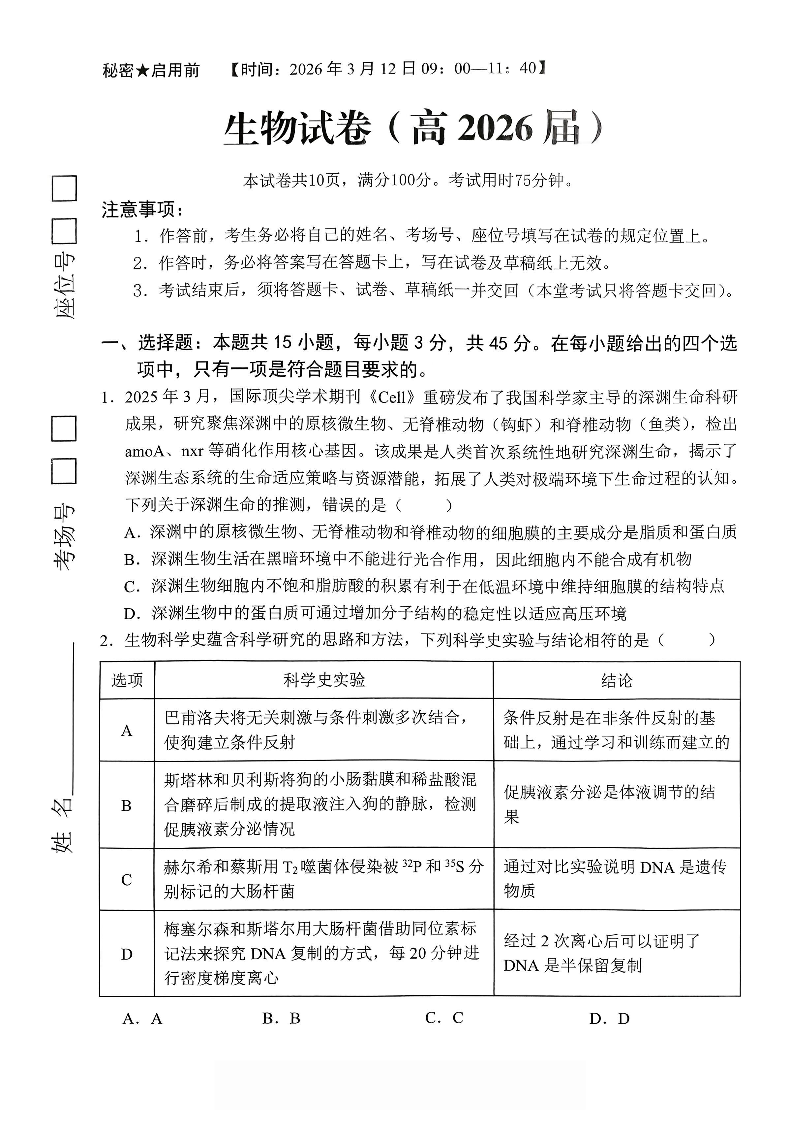 高三生物--重庆市名校联盟(七校联盟)2026届高三下学期3月开学联考