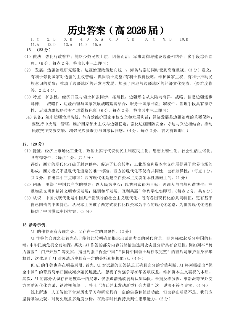 高三历史答案--重庆市名校联盟(七校联盟)2026届高三下学期3月开学联考