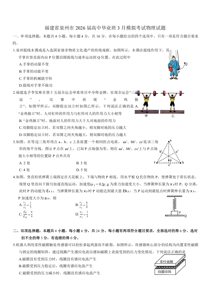 高三物理+答案--福建省泉州市2026届高中毕业班模拟考试(一)