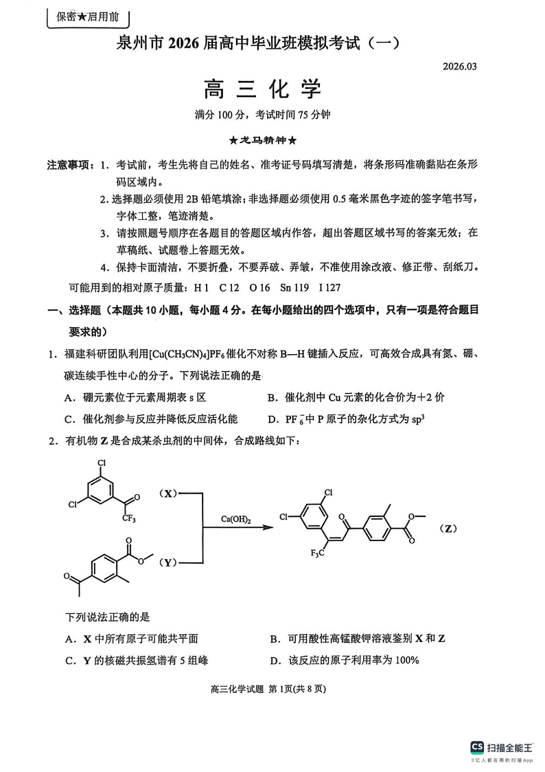 高三化学--福建省泉州市2026届高中毕业班模拟考试(一)