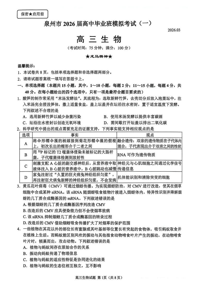 高三生物+答案--福建省泉州市2026届高中毕业班模拟考试(一)