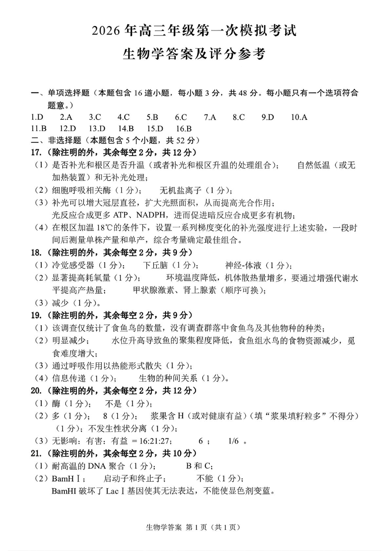高三生物答案--甘肃省2026届高三第一次模拟考试(甘肃一诊)