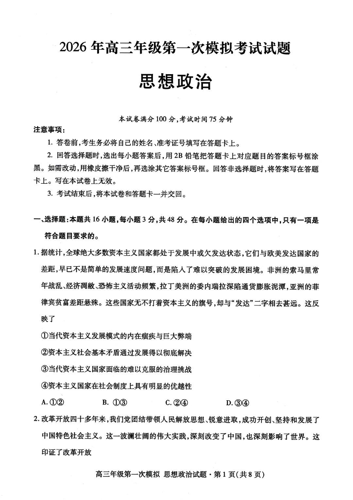 高三政治+答案--甘肃省2026届高三第一次模拟考试(甘肃一诊)