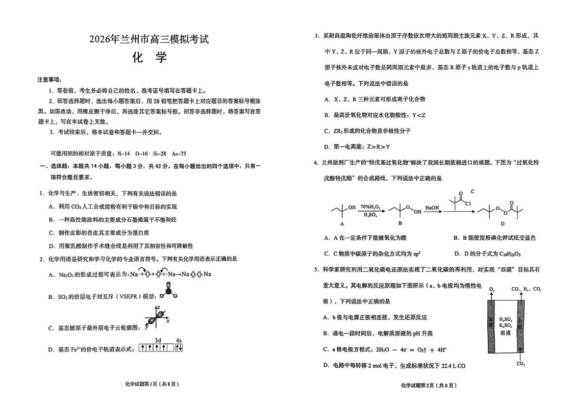 高三化学--甘肃省兰州市2026届高三下学期3月模拟考试(兰州一模)