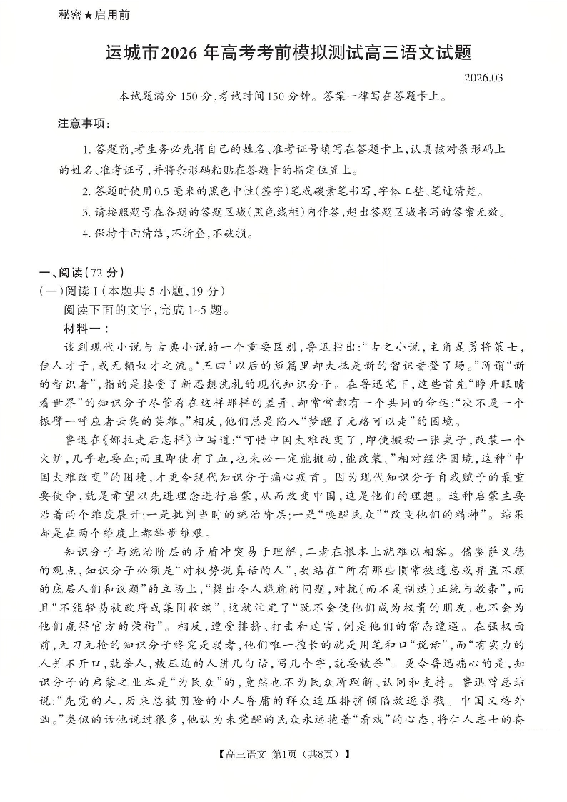 高三语文--山西运城市2026届高考考前模拟测试(运城一模)