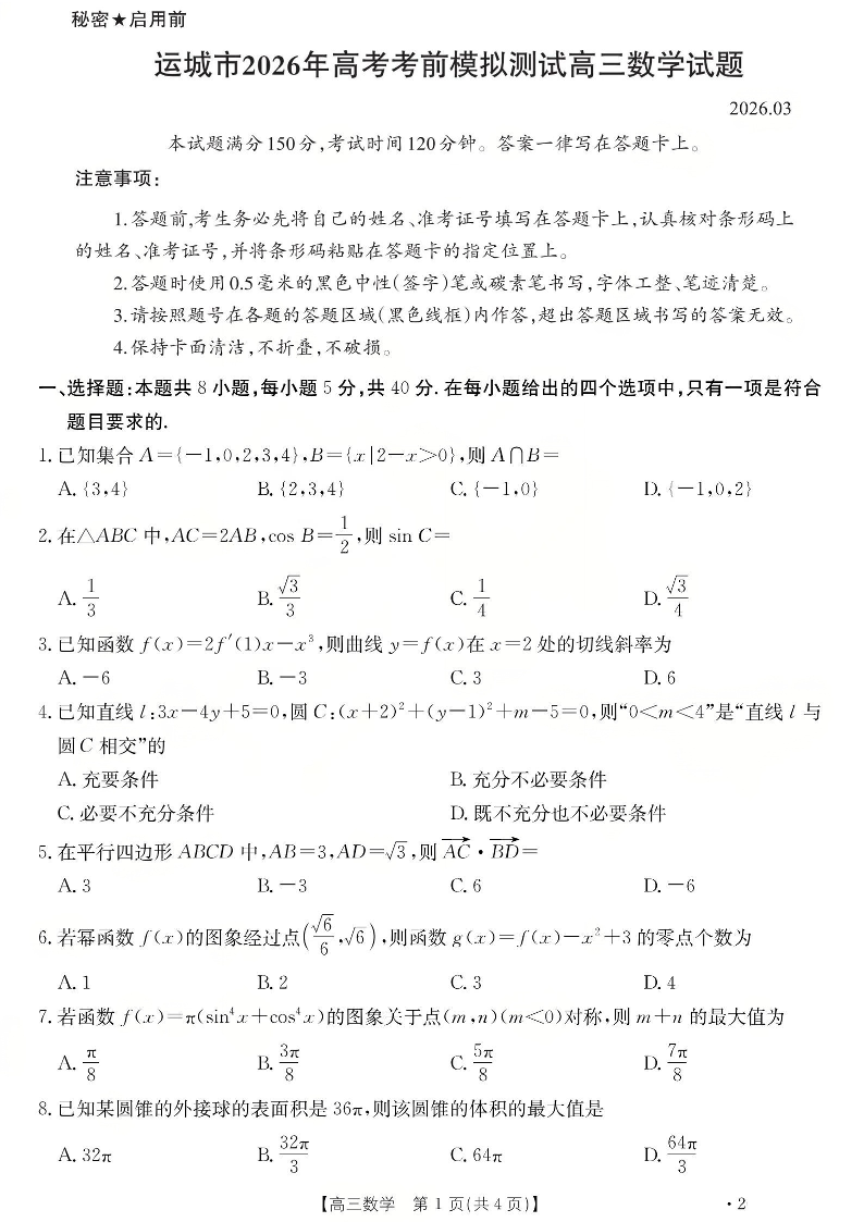 高三数学--山西运城市2026届高考考前模拟测试(运城一模)
