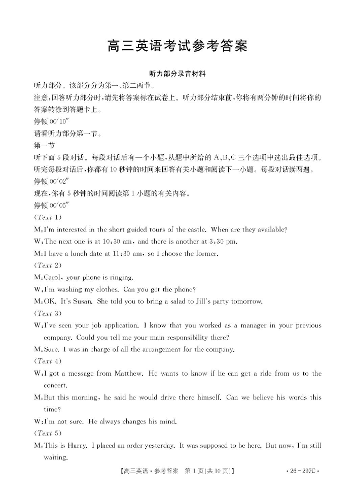 高三英语答案--山西运城市2026届高考考前模拟测试(运城一模)