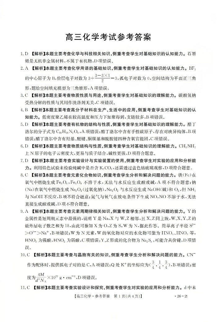 高三化学答案--山西运城市2026届高考考前模拟测试(运城一模)