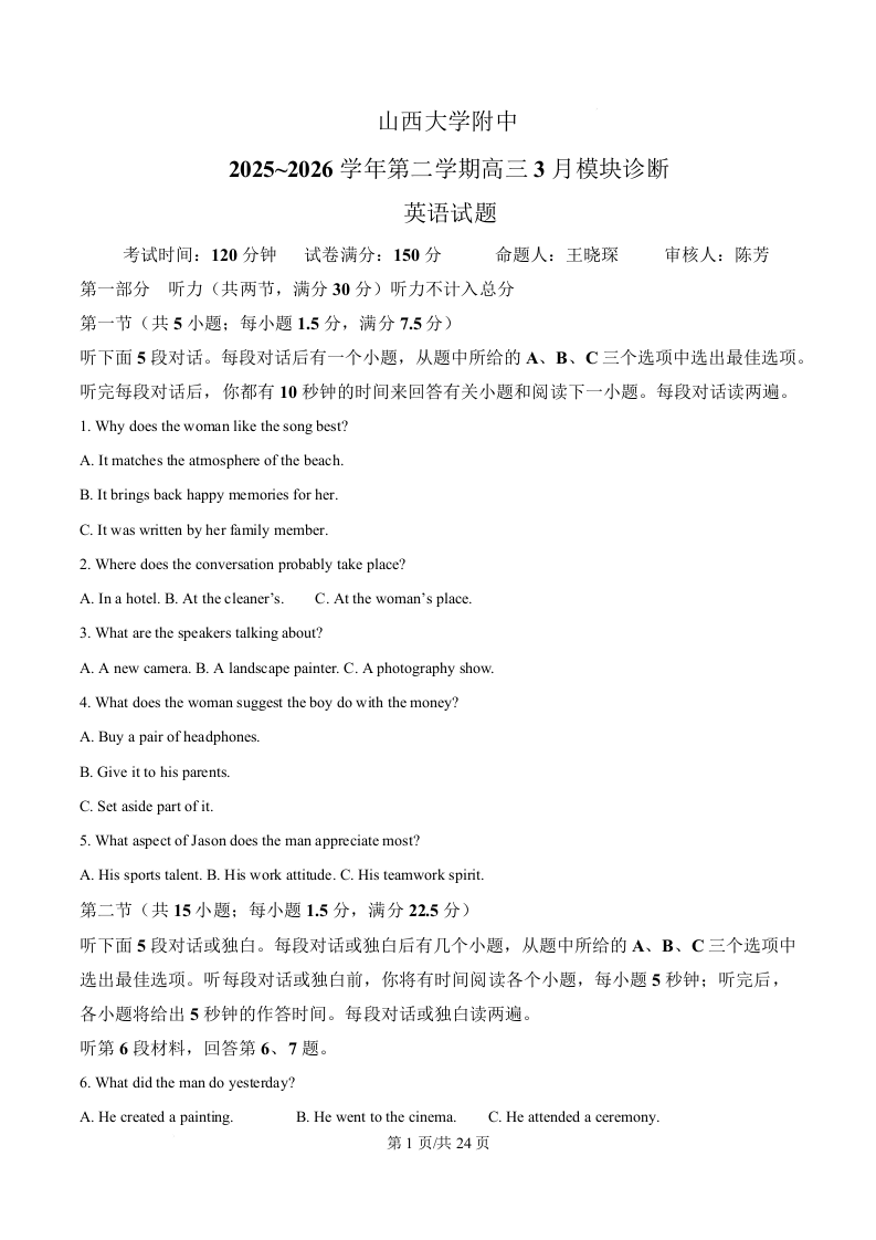 高三英语(精品解析版)--山西大学附属中学校2026届高三年级第二学期3月模块诊断