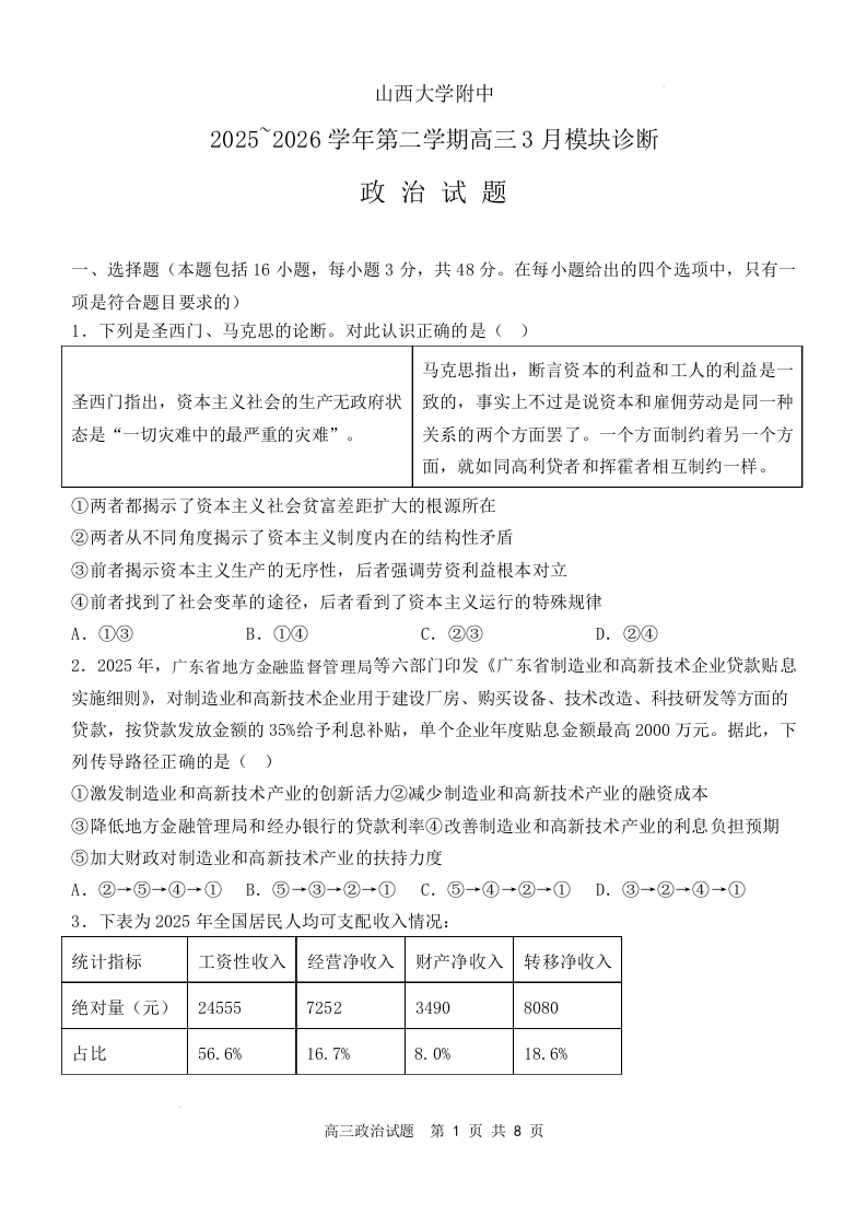 高三政治--山西大学附属中学校2026届高三年级第二学期3月模块诊断