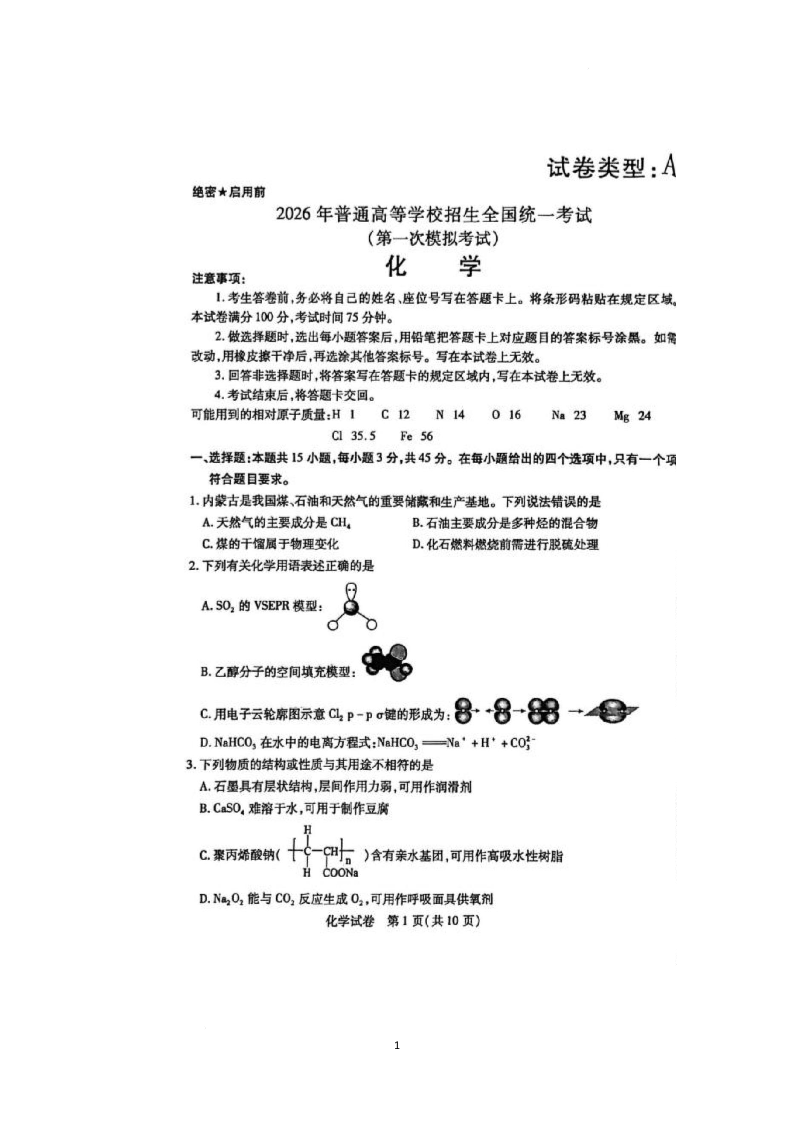 高三化学--内蒙古包头市 2026 届高三第一次模拟考试(包头一模)