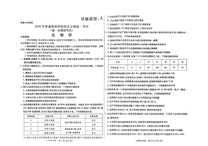 高三生物--内蒙古包头市 2026 届高三第一次模拟考试(包头一模)