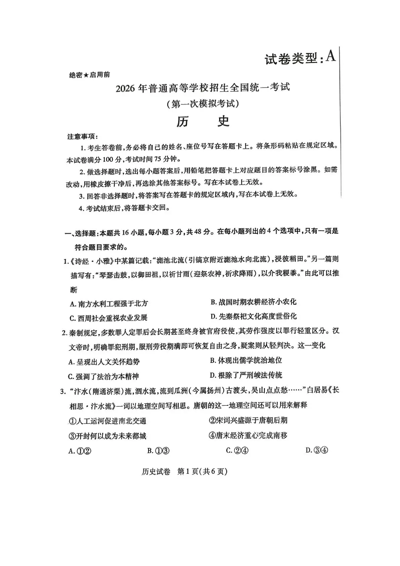 高三历史--内蒙古包头市 2026 届高三第一次模拟考试(包头一模)
