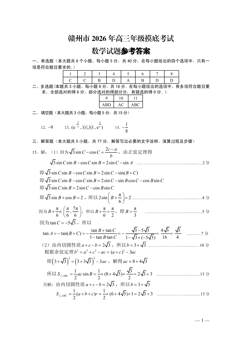 高三数学答案--江西省赣州市2026届高三下学期3月摸底考试