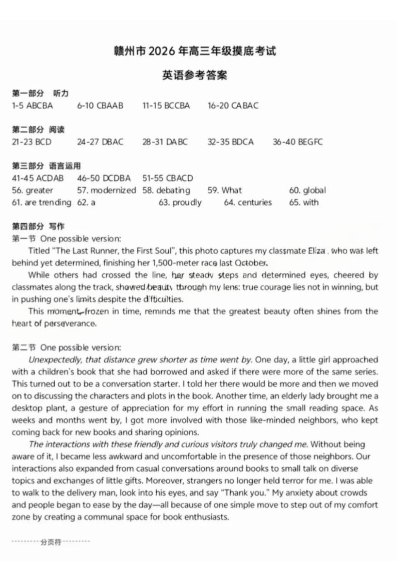 高三英语答案--江西省赣州市2026届高三下学期3月摸底考试