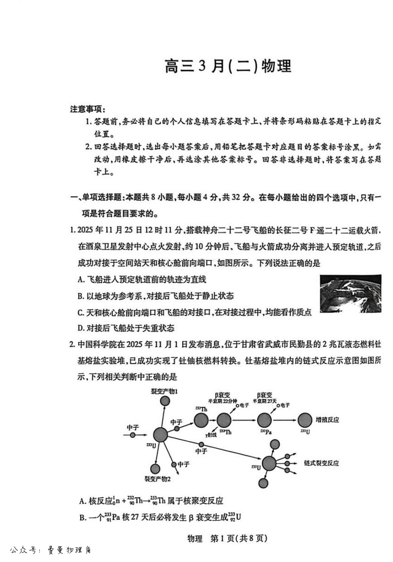 高三物理+答案--安徽省合肥市第八中学2026届高三下学期3月模拟预测(二)