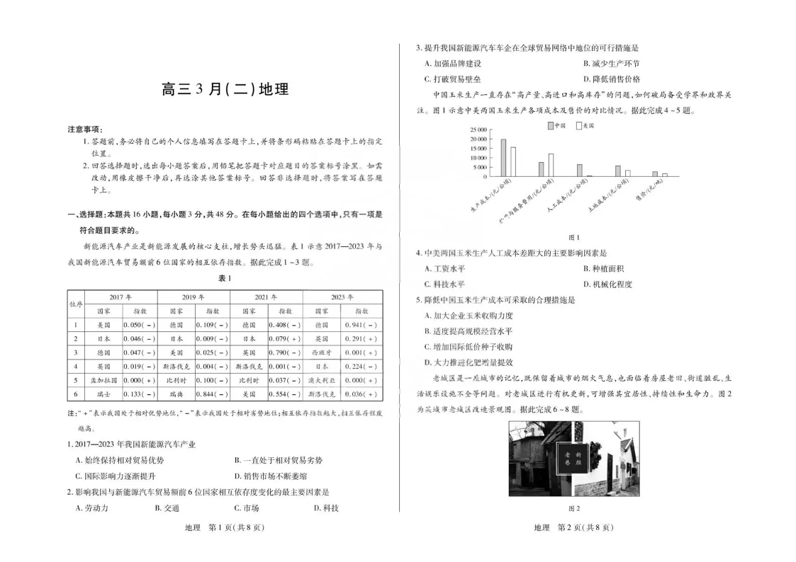 高三地理--安徽省合肥市第八中学2026届高三下学期3月模拟预测(二)