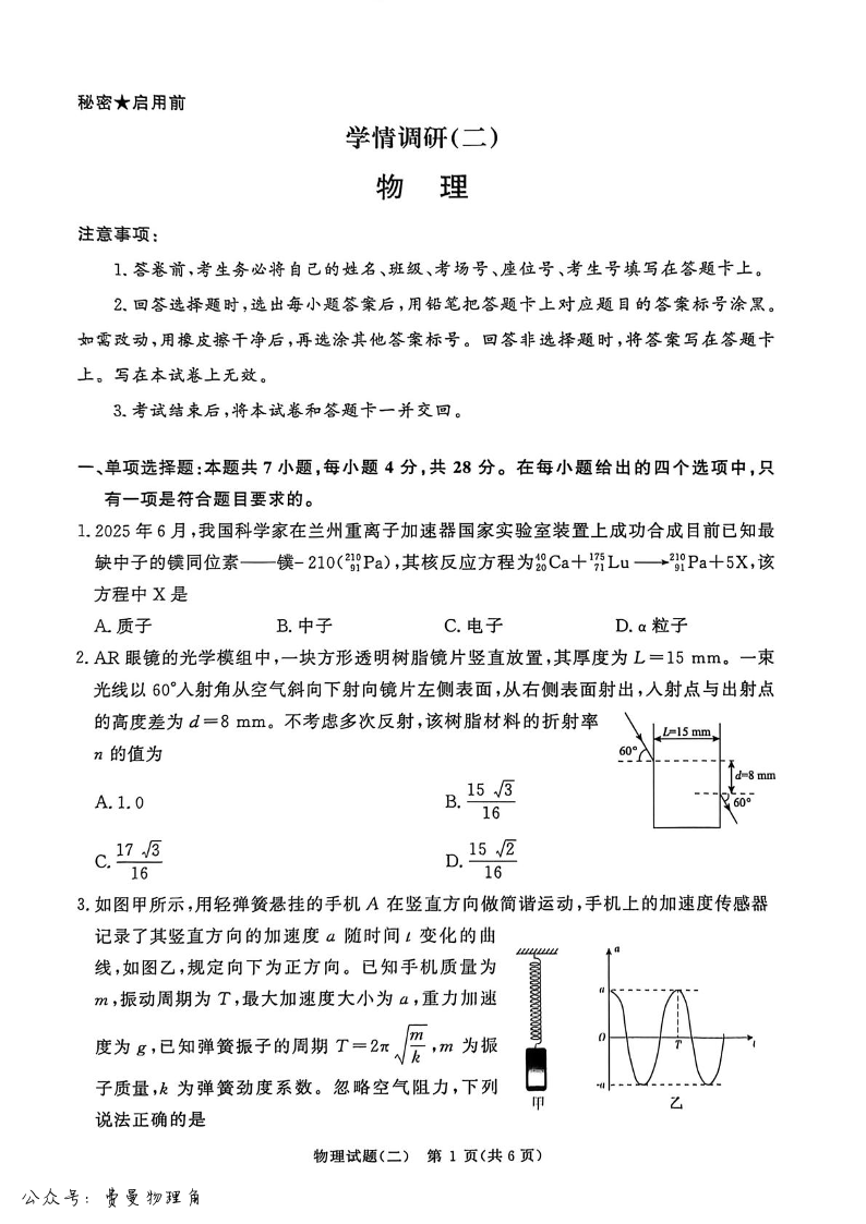 高三物理+答案--河南省青桐鸣大联考2026届高三下学期学情调研(二)