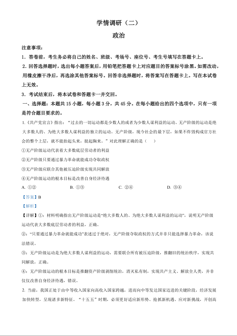 高三政治答案--河南省青桐鸣大联考2026届高三下学期学情调研(二)