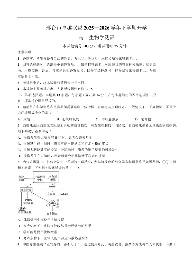 高二生物+答案--河北省邢台市卓越联盟2025-2026学年高二下学期开学测评