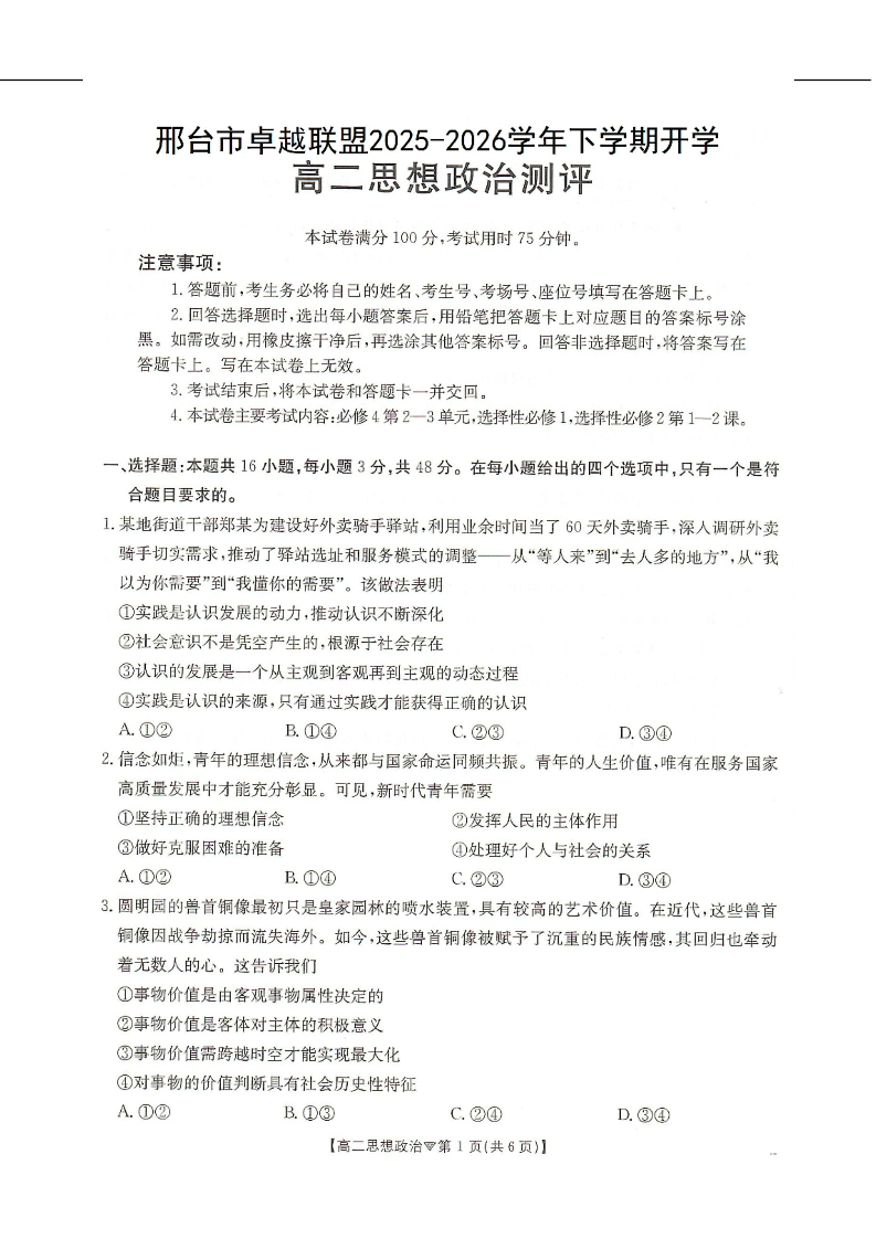 高二政治--河北省邢台市卓越联盟2025-2026学年高二下学期开学测评