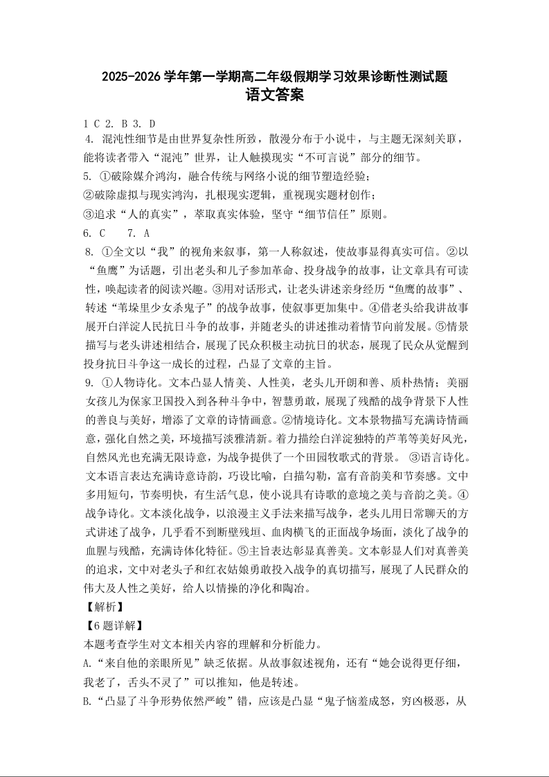 高二语文答案--山西省阳泉市2025-2026学年高二第二学期开学检测