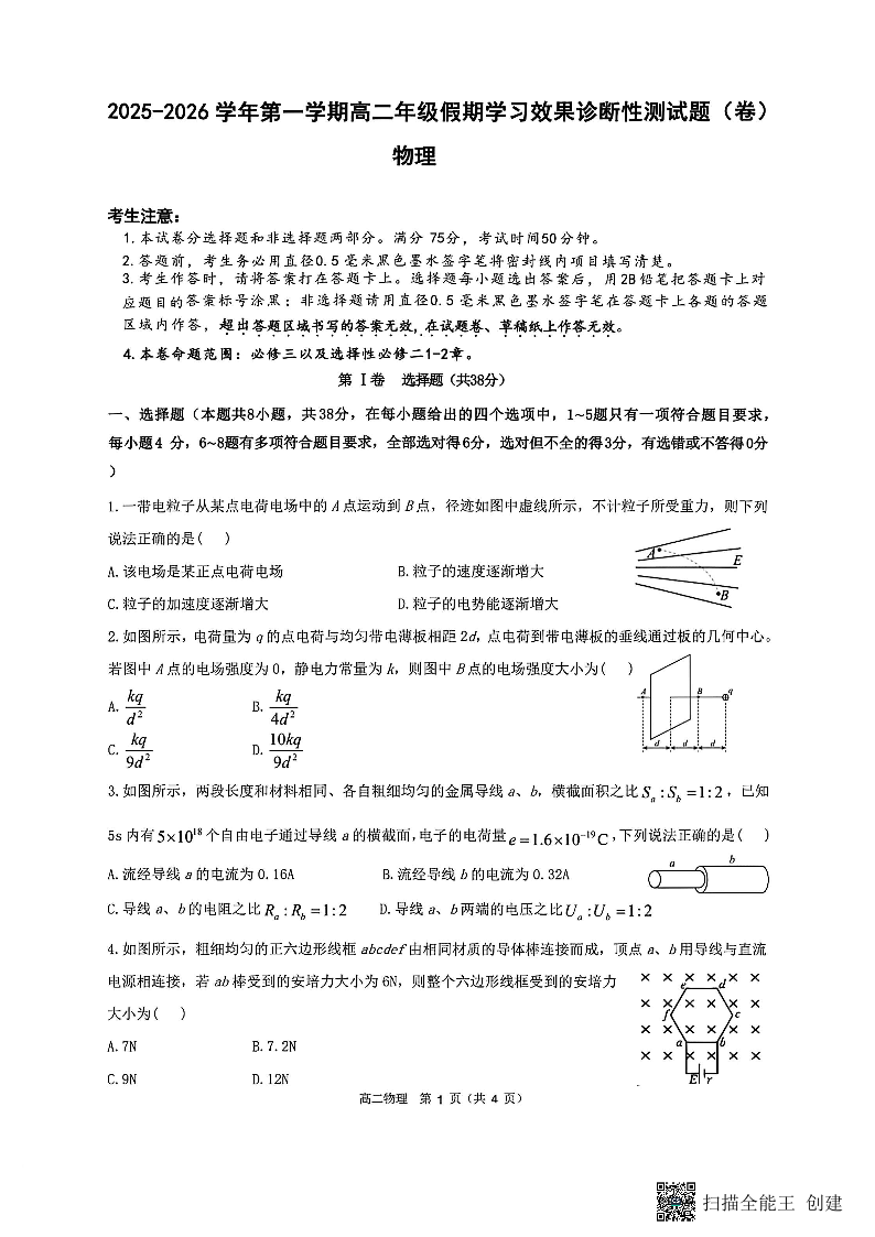 高二物理--山西省阳泉市2025-2026学年高二第二学期开学检测