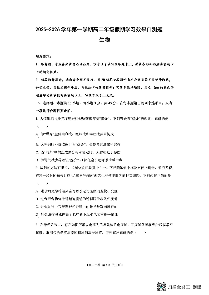 高二生物--山西省阳泉市2025-2026学年高二第二学期开学检测