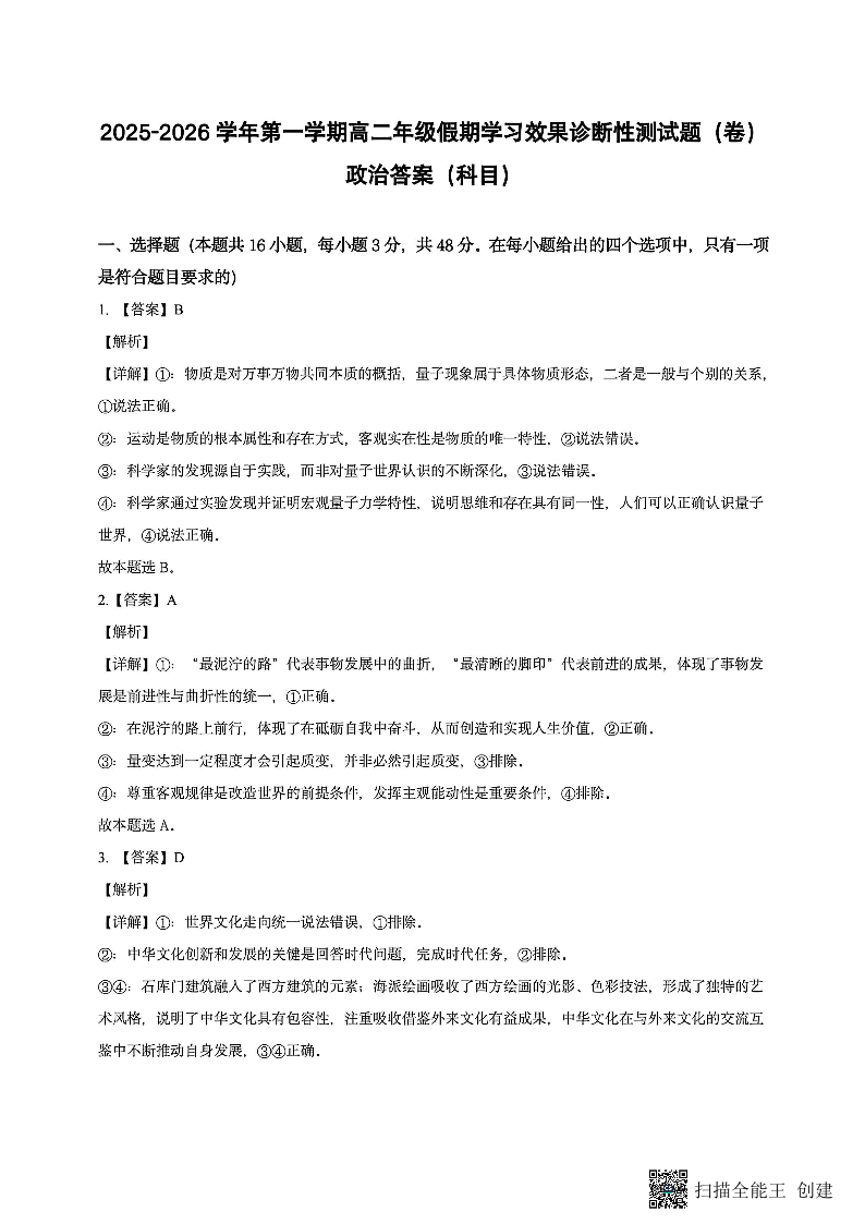 高二政治答案--山西省阳泉市2025-2026学年高二第二学期开学检测