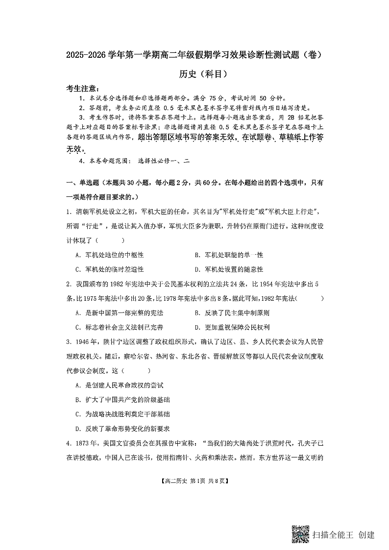 高二历史--山西省阳泉市2025-2026学年高二第二学期开学检测