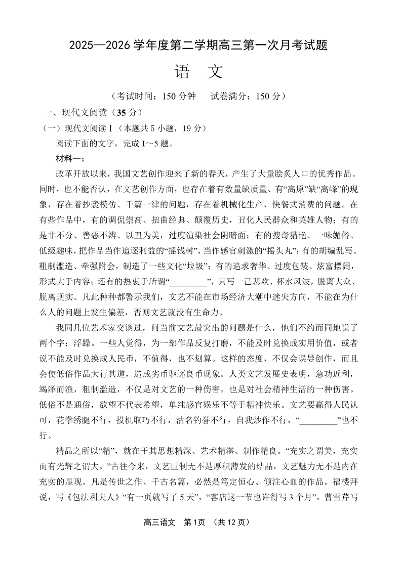 高三语文--海南省文昌中学2026届高三第二学期第一次月考