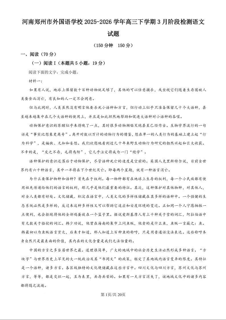 高三语文(解析版)--河南郑州市外国语学校2026届高三下学期3月阶段检测