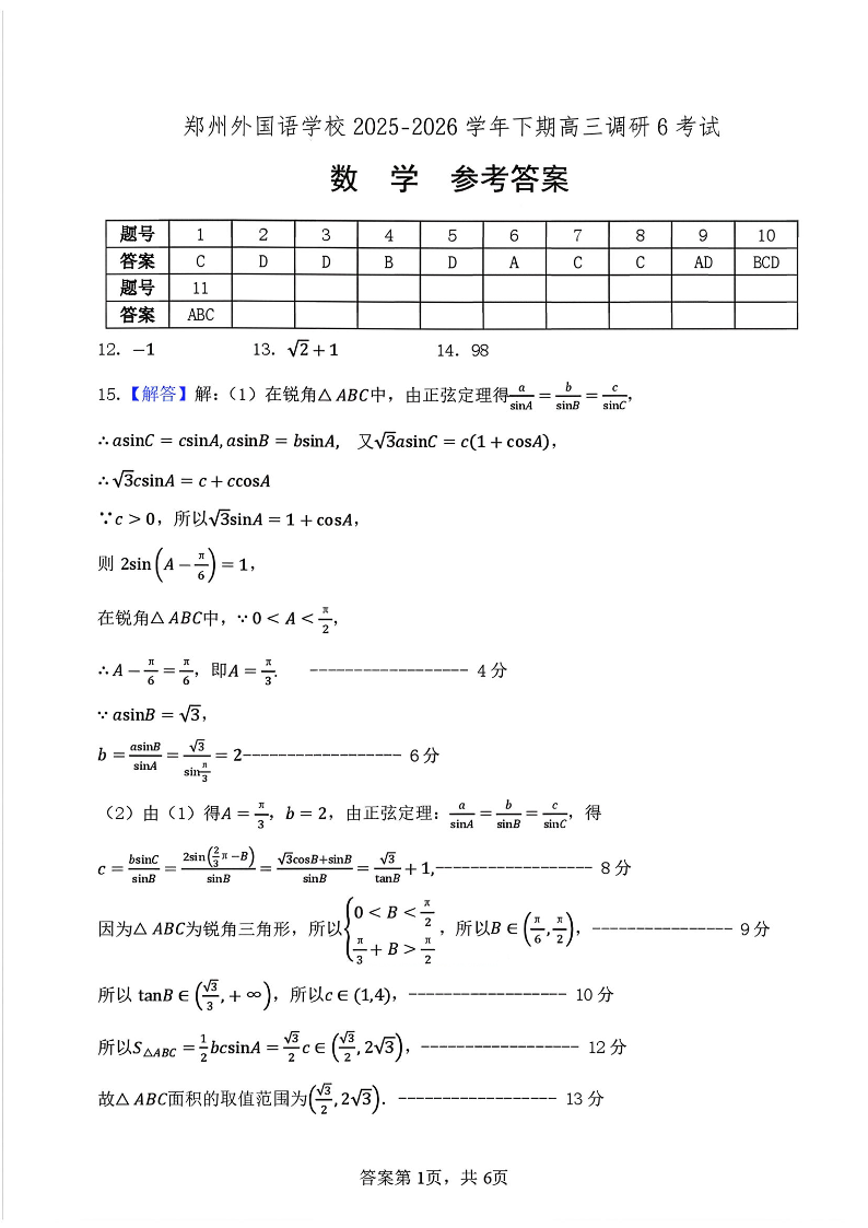 高三数学答案--河南郑州市外国语学校2026届高三下学期3月阶段检测