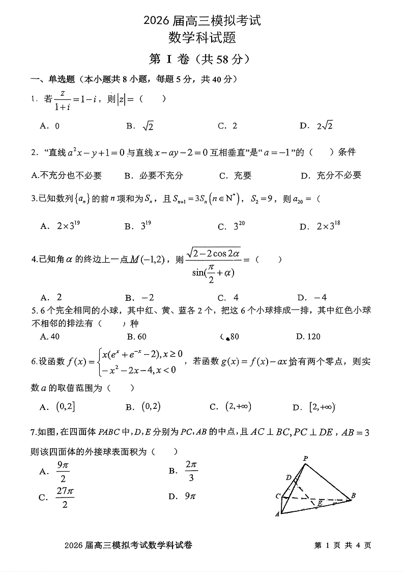 高三数学--吉林省五校联考(长春11高、四平一中等)2026届高三3月模拟考试