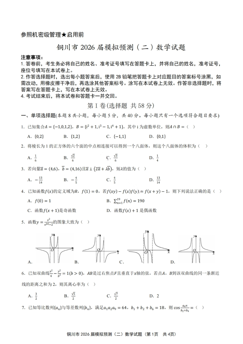高三数学--陕西省铜川市2026届高三第二次模拟考试(铜川二模)