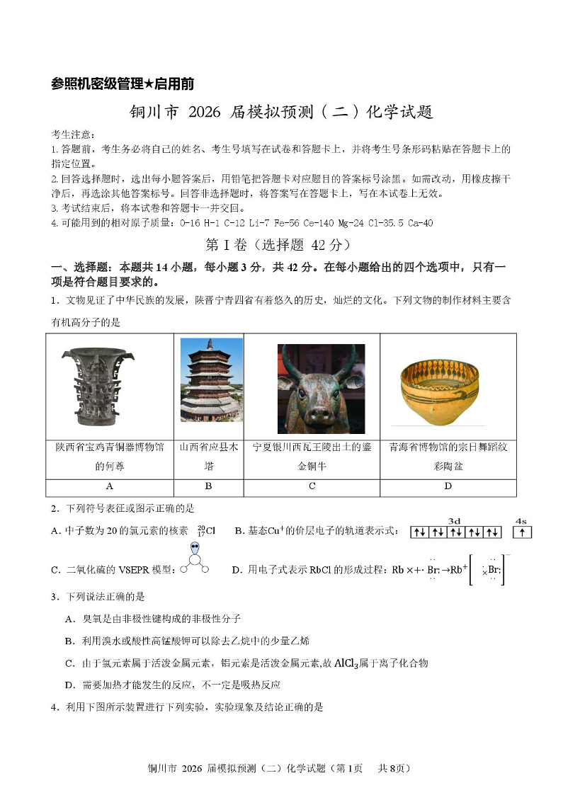 高三化学+答案--陕西省铜川市2026届高三第二次模拟考试(铜川二模)