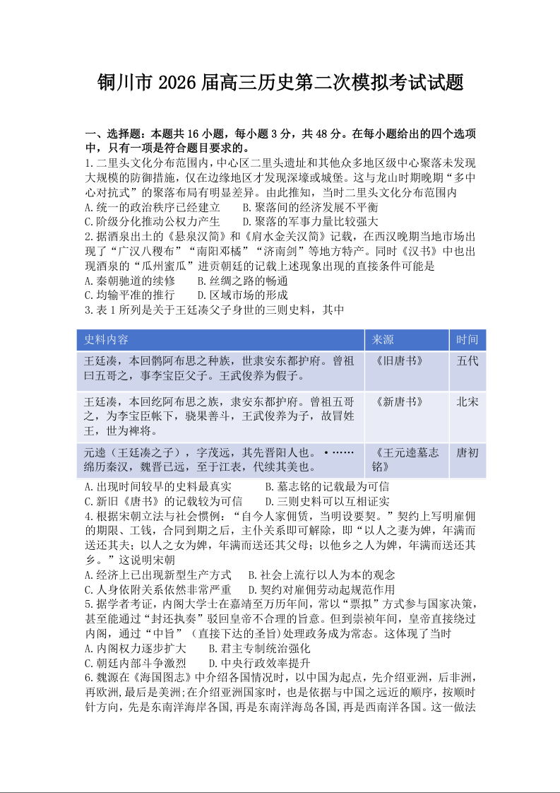高三历史+答案--陕西省铜川市2026届高三第二次模拟考试(铜川二模)