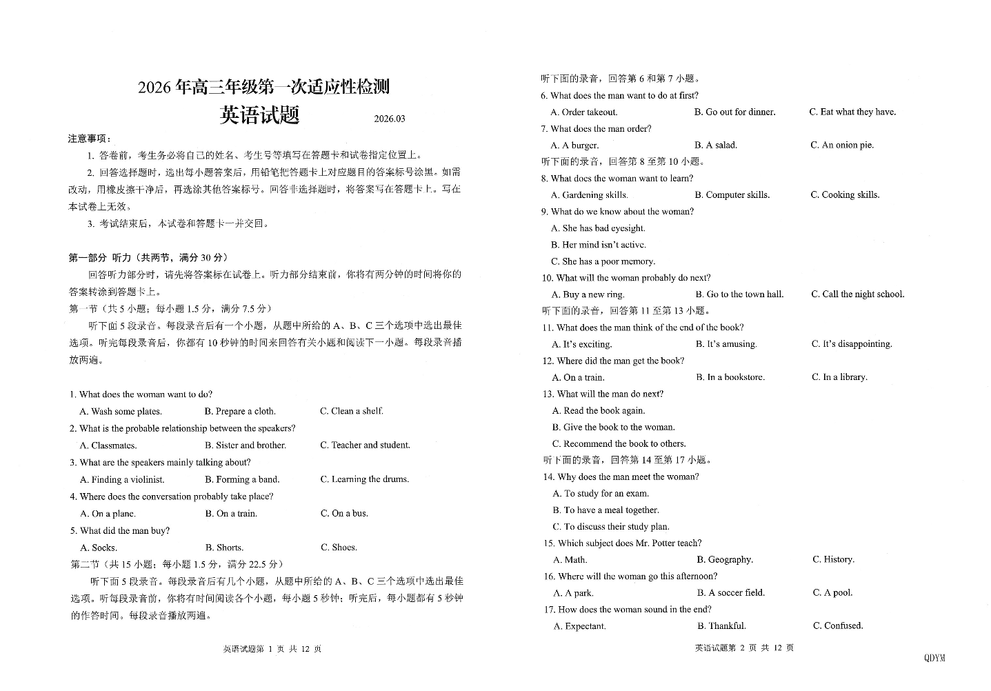 高三英语--山东省青岛市2026.3高三第一次模拟检测