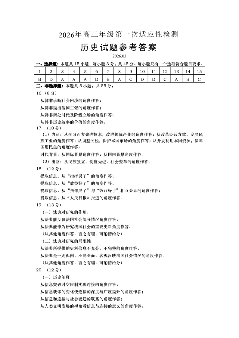 高三历史答案--山东省青岛市2026.3高三第一次模拟检测