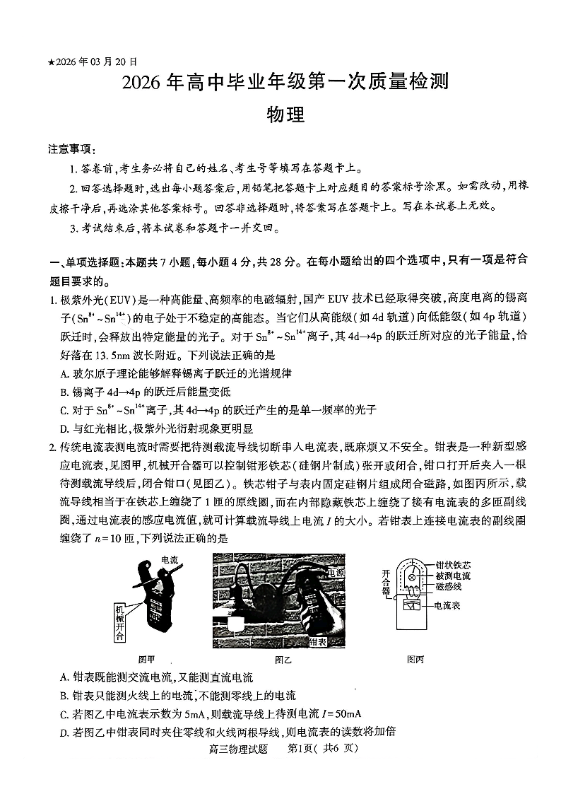高三物理--河南省五市2026届高三3月第一次质量检测