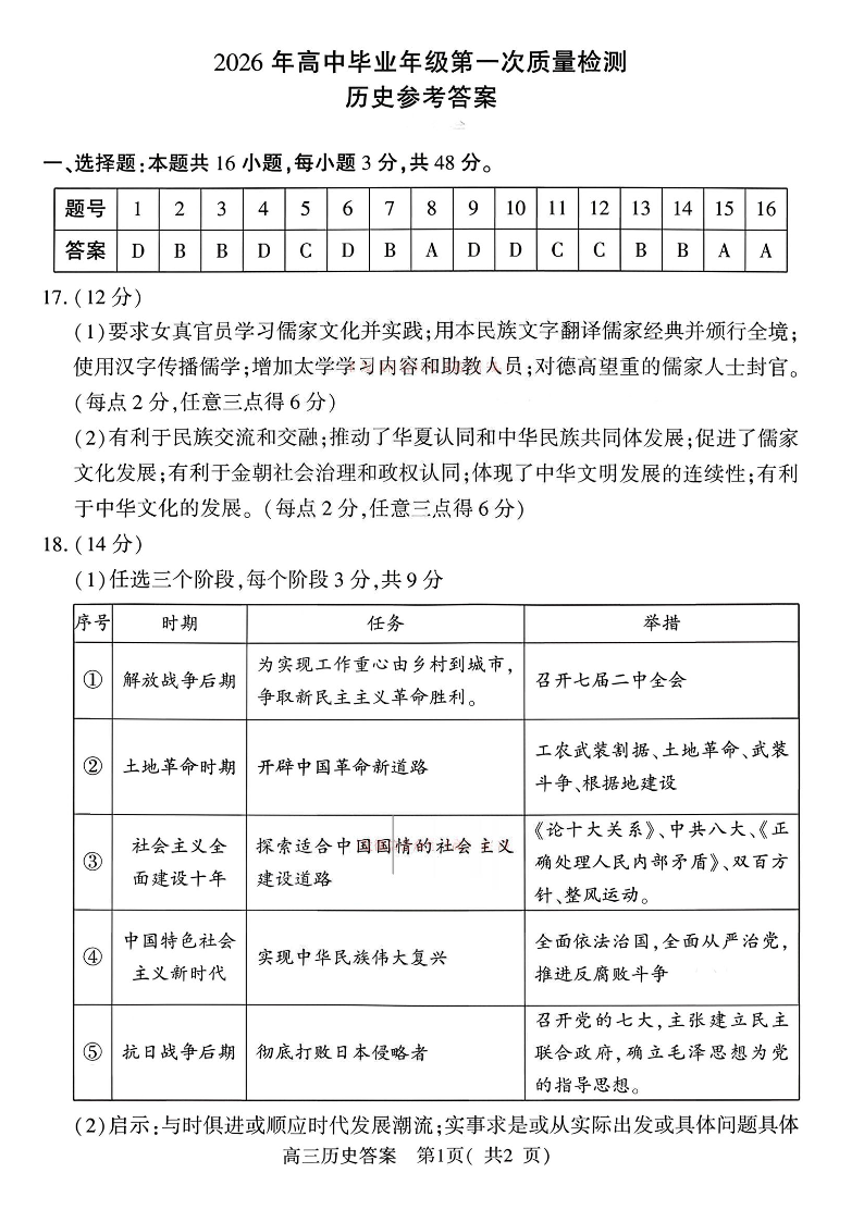 高三历史答案--河南省五市2026届高三3月第一次质量检测