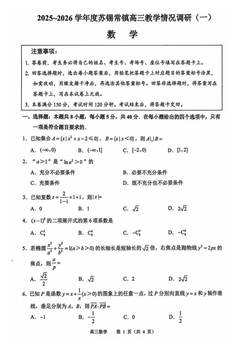 高三数学+答案--江苏省苏锡常镇四市高三下学期3月教学情况调研(一)