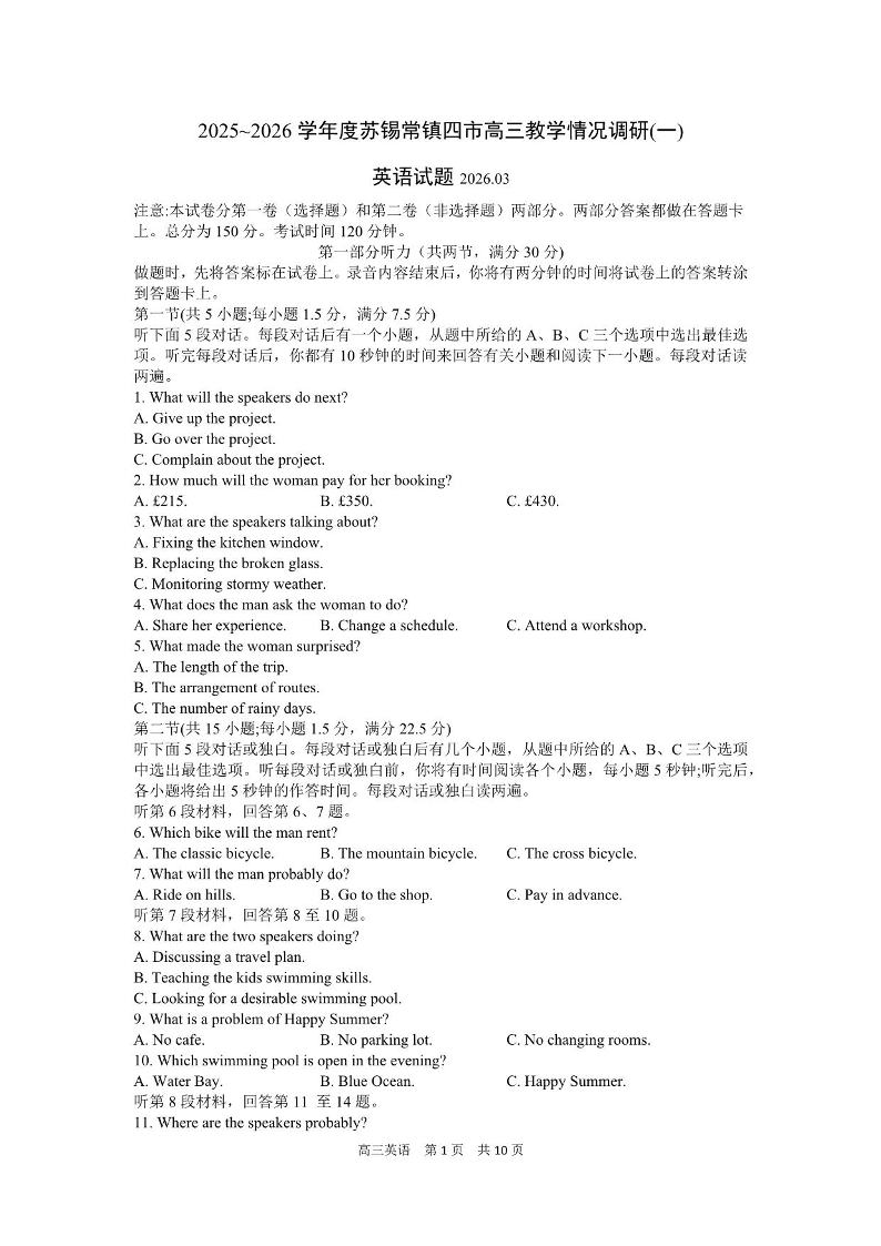 高三英语答案--江苏省苏锡常镇四市高三下学期3月教学情况调研(一)