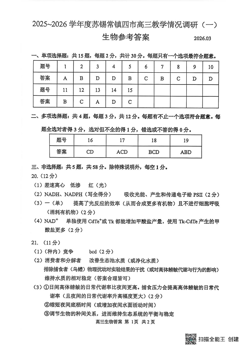 高三生物答案--江苏省苏锡常镇四市高三下学期3月教学情况调研(一)