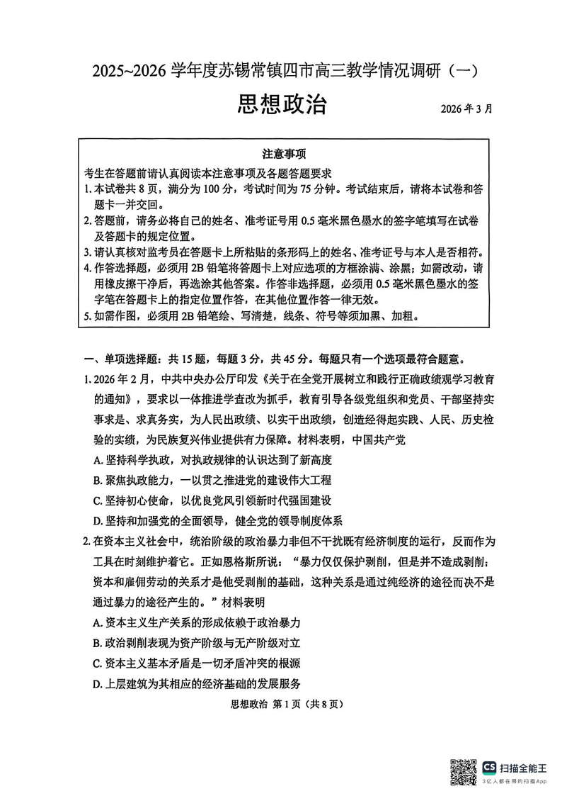 高三政治--江苏省苏锡常镇四市高三下学期3月教学情况调研(一)